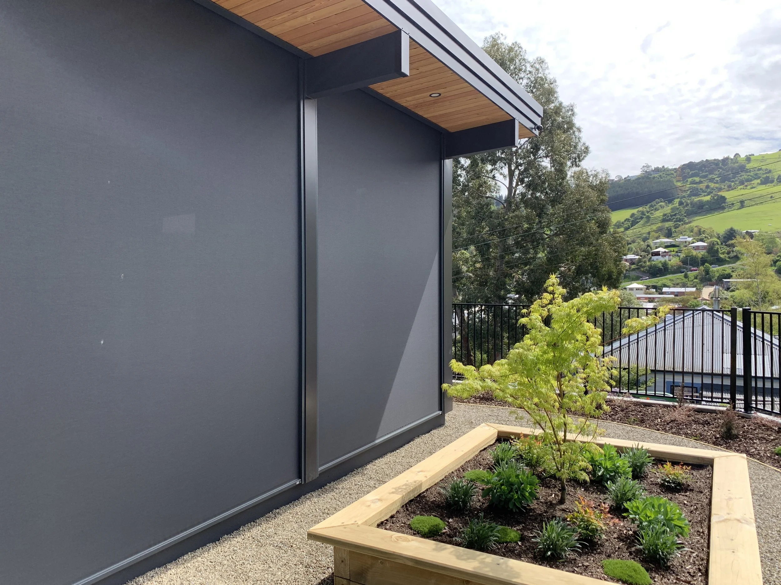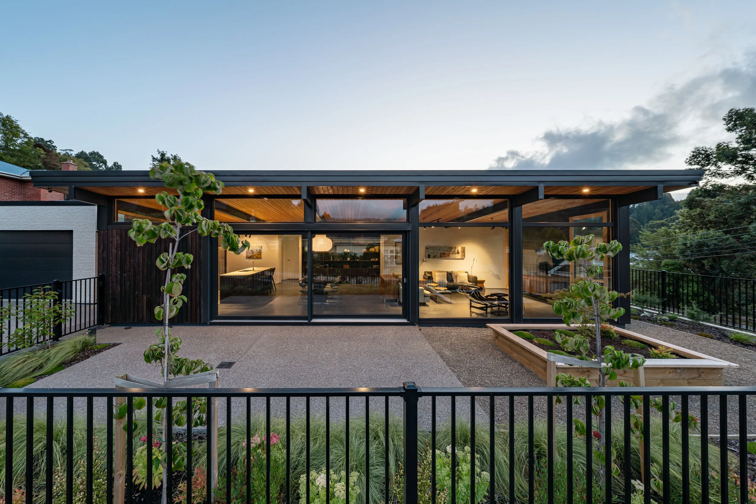 This striking residence seamlessly blends form and function with its generously glazed facade, allowing abundant natural light to flood the interiors. The extensive glazing is thoughtfully tempered by external roller blinds, discreetly concealed within the soffits, which can be lowered to provide shade and enhance thermal performance—a critical feature for Dunedin’s variable climate.