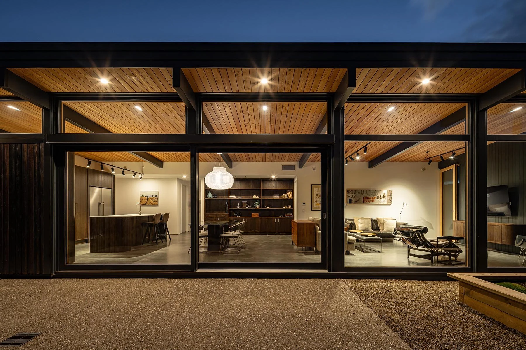 The house’s exterior showcases a refined material palette, with dark vertical timber cladding contrasted against crisp white brickwork, creating a dynamic interplay of textures. A sleek, low-pitched roof with deep eaves and exposed timber soffits nods to midcentury aesthetics while ensuring passive solar gain is optimised. Internally, the open-plan living spaces are defined by clean lines, warm wooden finishes, and polished concrete floors, fostering a sense of airy sophistication. Large sliding doors connect the interior to a landscaped courtyard, blurring the boundary between inside and out.