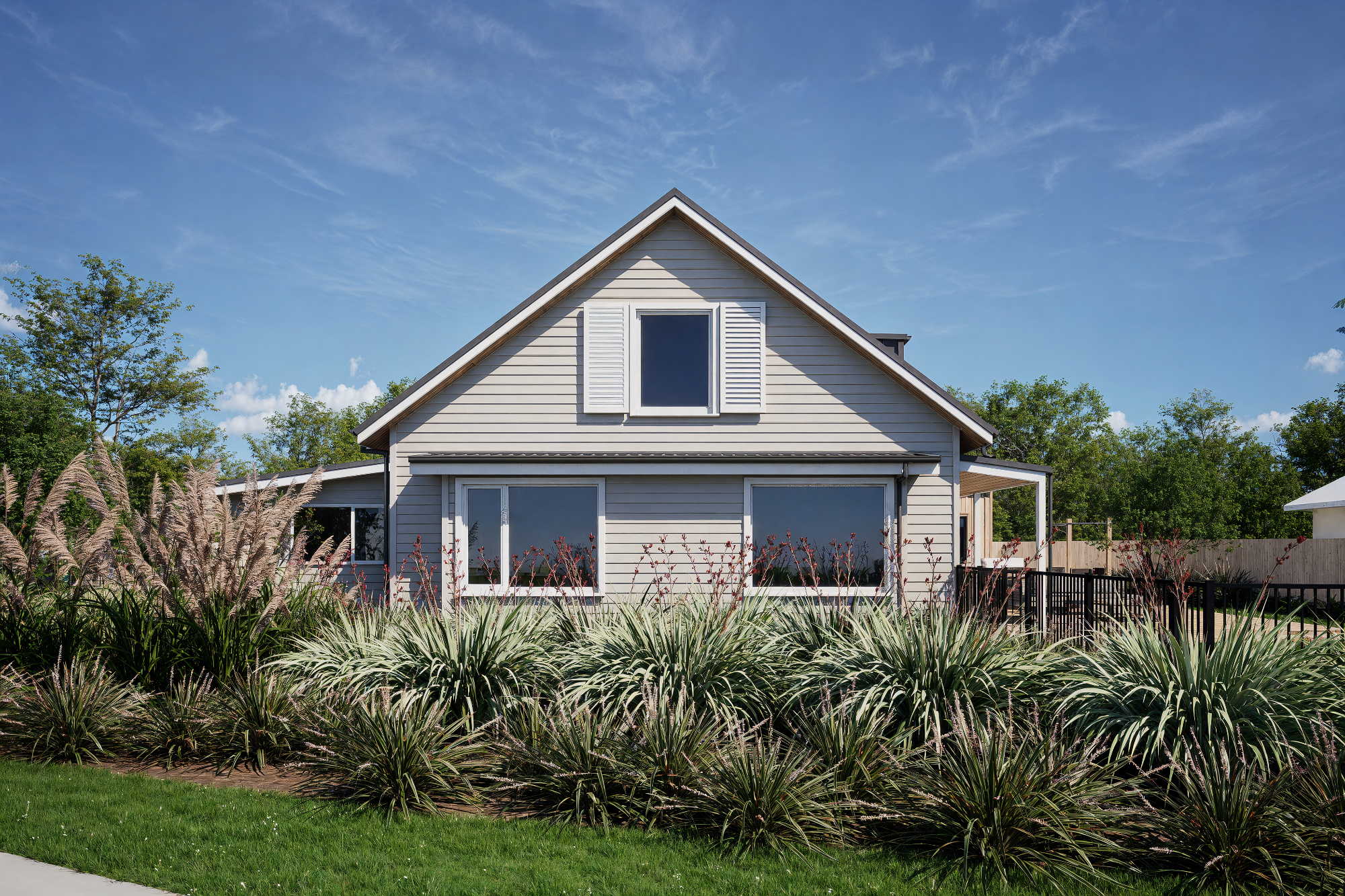 The design brief for this project in Te Anau called for a new traditional looking 3 bedroom passivhaus and a high ceiling workshop space containing a small secondary dwelling.